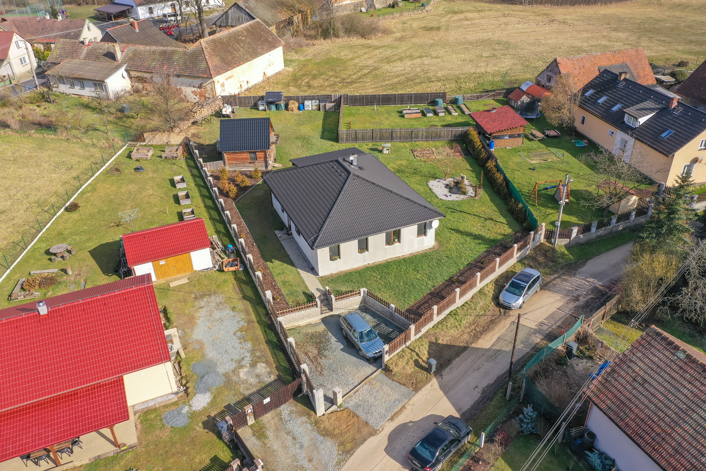 Kolem domu je na pozemku spousta prostoru. Najdete zde také jezírko, vrt, prostor pro záhony nebo chov domácích zvířat.